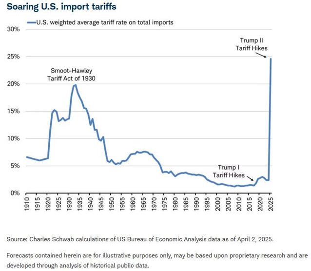 The chart below suggests that, directionally, the new proposed tariffs are orders-of-magnitude above what markets managed through during the first Trump administration. Even with yesterday’s “90-day pause,” note that the baseline tariff rate of 10%, which is still in effect, is more than double the trailing 50-year average.